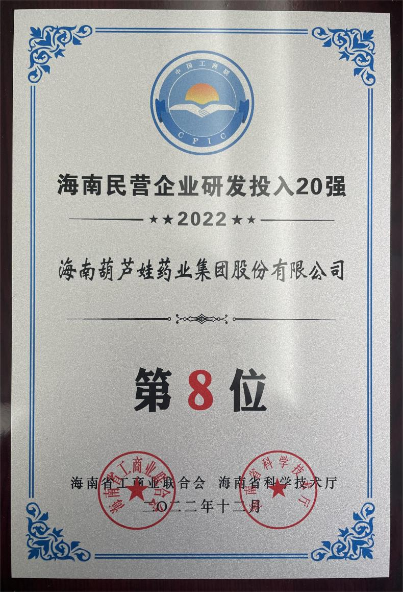 12月23日,2022海南民营企业50强和研发投入20强发布会在海口举行。会上发布了“2022海南民营企业50强”“2022海南民营企业研发投入20强”榜单和分析报告。尊龙官方网站药业再次荣登两榜,在海南民营企业50强榜单中位列第25位,较去年上升8位,这也是公司连续三年登榜;在海南民营企业研发投入20强中位列第8位,较去年上升7位。